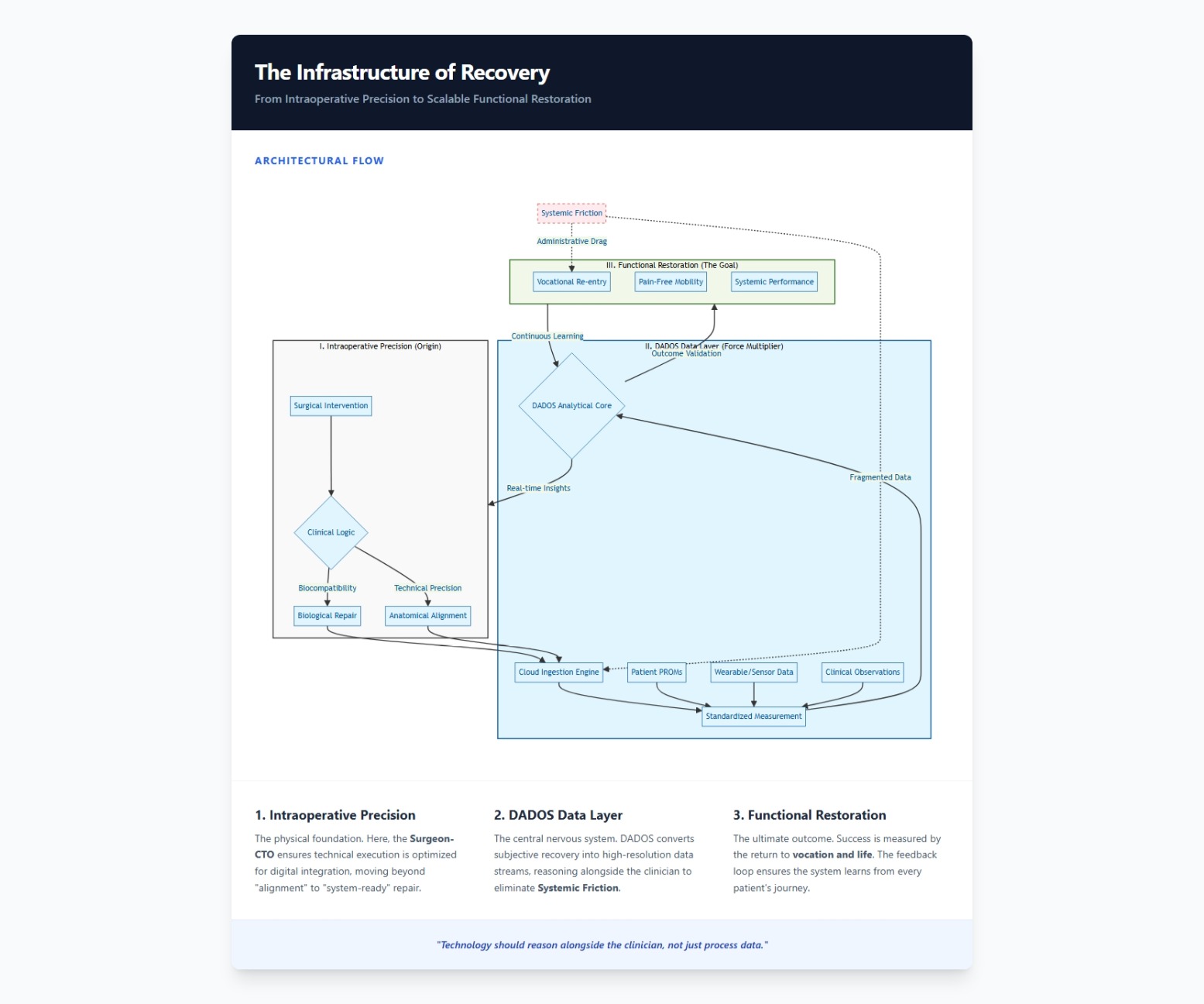 To scale the path to recovery, we must embed outcome measurement into the very Systemic DNA of the surgical process. This is the core philosophy behind DADOS (Data-Driven Outcomes System). We move from anatomical snapshots to a longitudinal stream of functional metrics.
